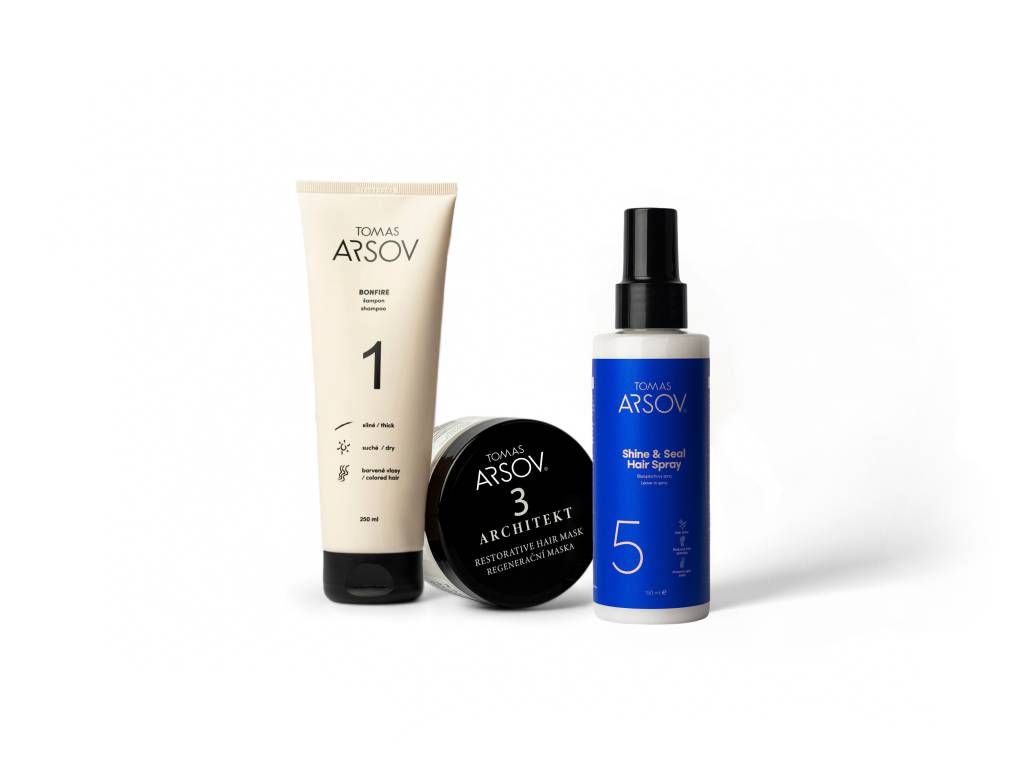 Expresný trojkrokový rituál TOMAS ARSOV systematicky opravuje vlasy od jadra až po povrch. Šampón BONFIRE pramene šetrne hydratuje a pripraví, maska ARCHITEKT masívne spevní ich stred a sérum SHINE & SEAL na záver hladko uzamkne povrch vlasu.